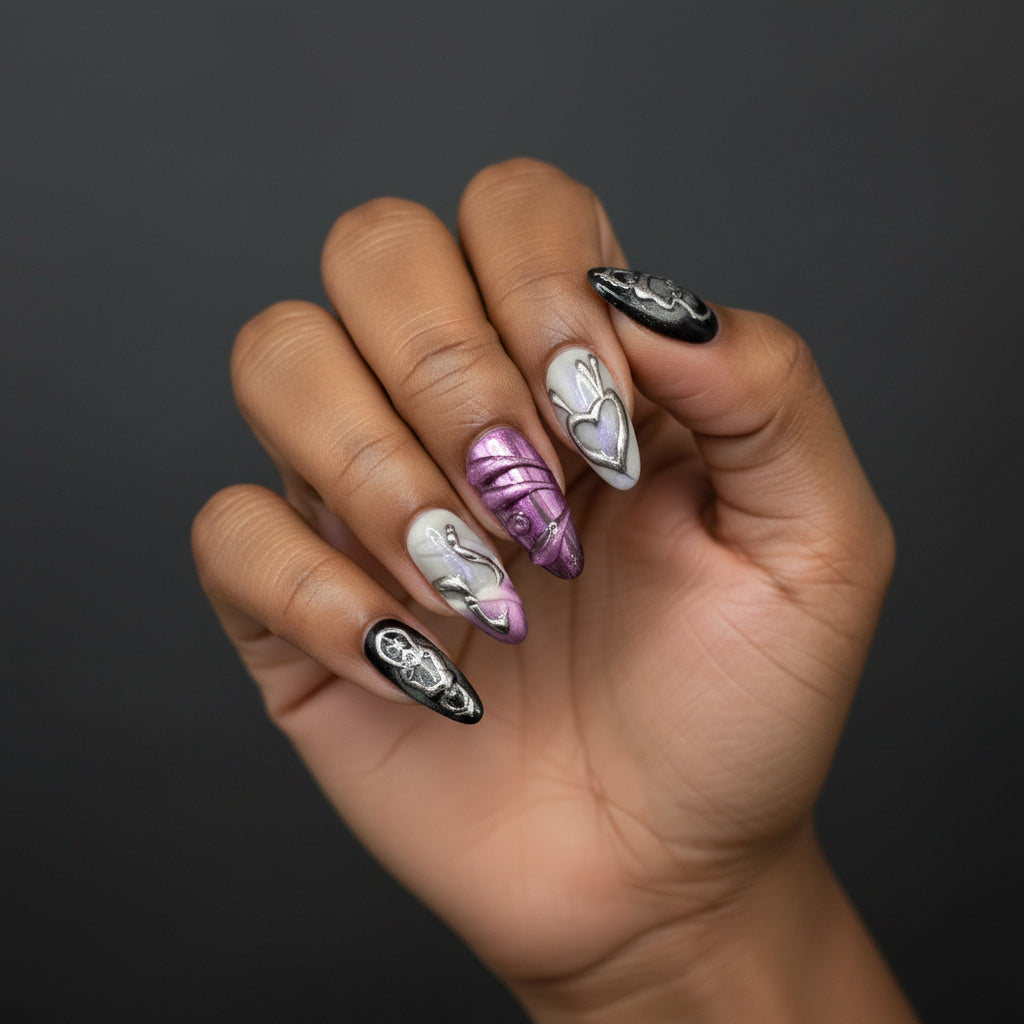 Amethyst Aura is a stunning fusion of metallic magic and dreamy purple tones. This artistic set blends deep black, shimmering silver, soft lavender, and bold amethyst with sculpted 3D line work that adds texture, depth, and instant wow-factor. Each nail features its own abstract design, making the entire set look like wearable artwork.