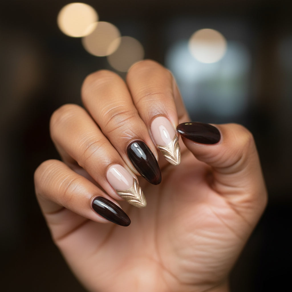 Golden Mocha Drip blends rich mocha tones with soft nude elegance and luxe sculpted gold details. This set features deep espresso tips, creamy nude accents, and raised gold designs that add dimension, sparkle, and a couture-inspired finish. The glossy shine brings everything together for a warm, glamorous look that’s perfect for any season.