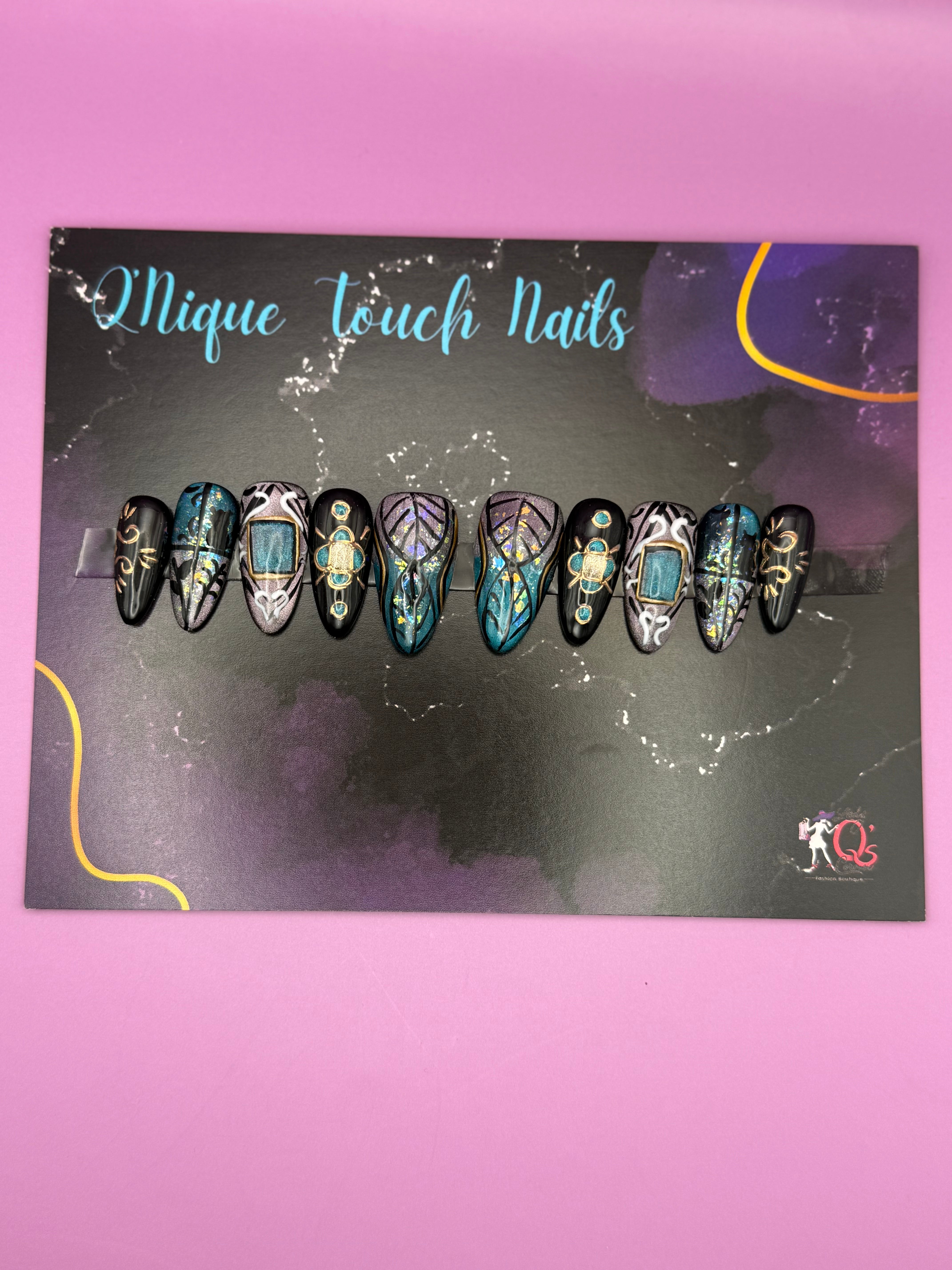 Black-based nails dressed in teal, gold, and chrome hieroglyph-style detailing — mysterious, regal, and built to glow like royalty at night.