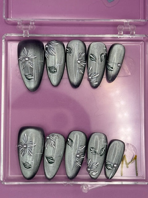 A dreamy silver-gray stiletto set with soft floral detailing and a subtle glow. Calm, elegant, and endlessly wearable.