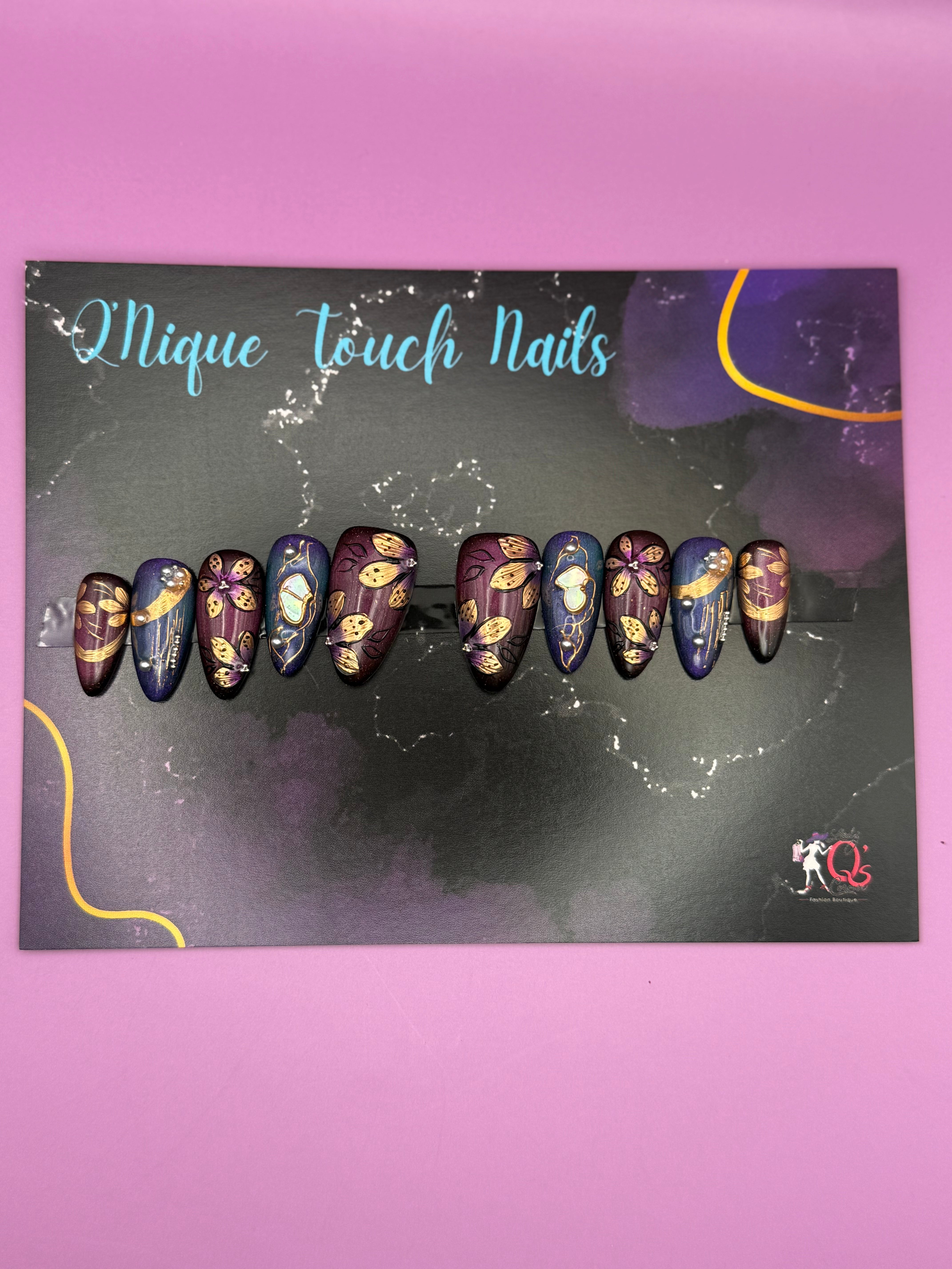 A deep plum-to-midnight ombré with gold leaf details and opal accents — rich, regal, and made to glow against melanin. Perfect for evening glam and statement moments.