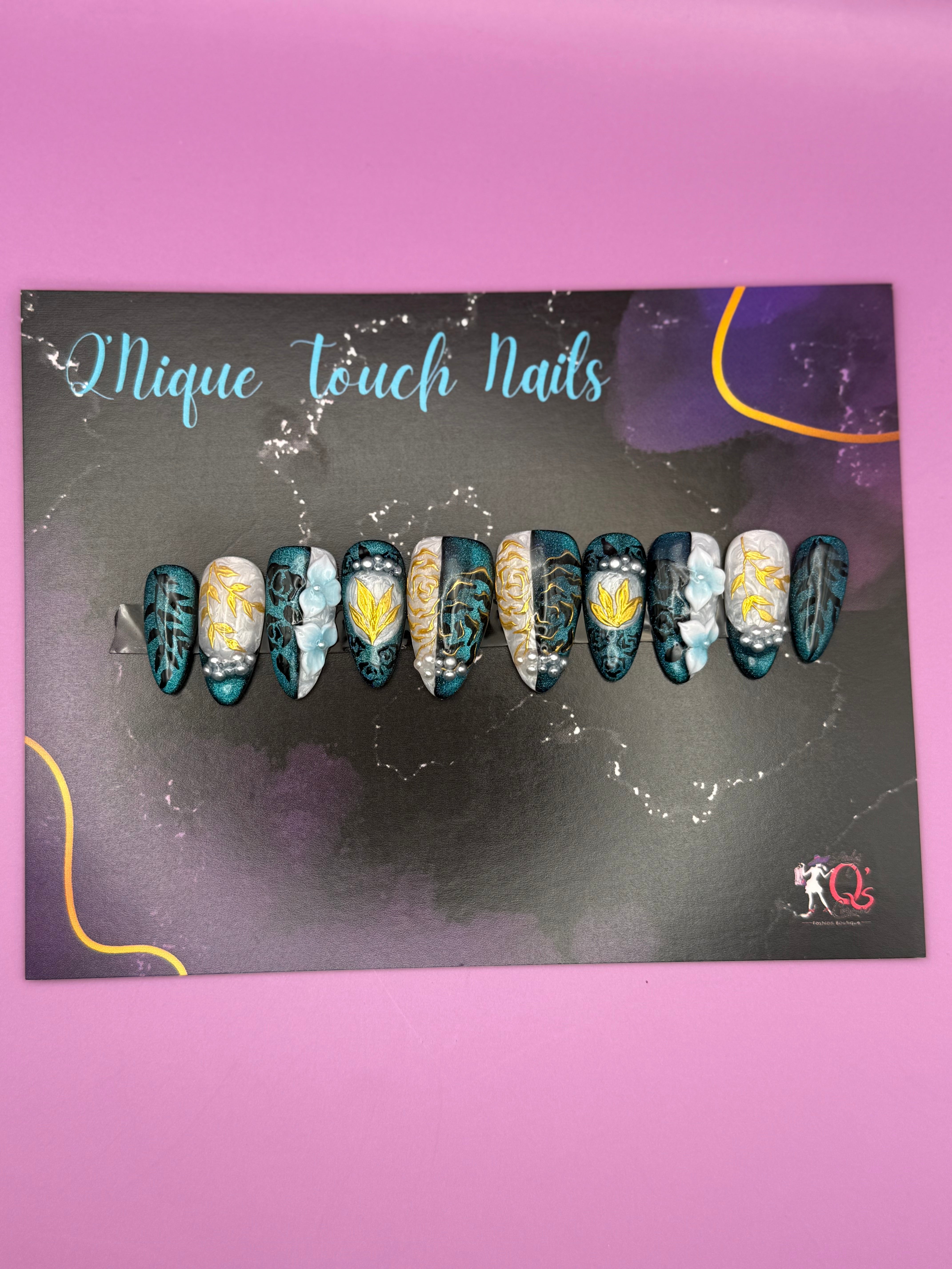 Glittering teal and ivory nails dressed in gold line art, pearls, and 3-D florals — a soft-luxury fantasy for glam lovers.