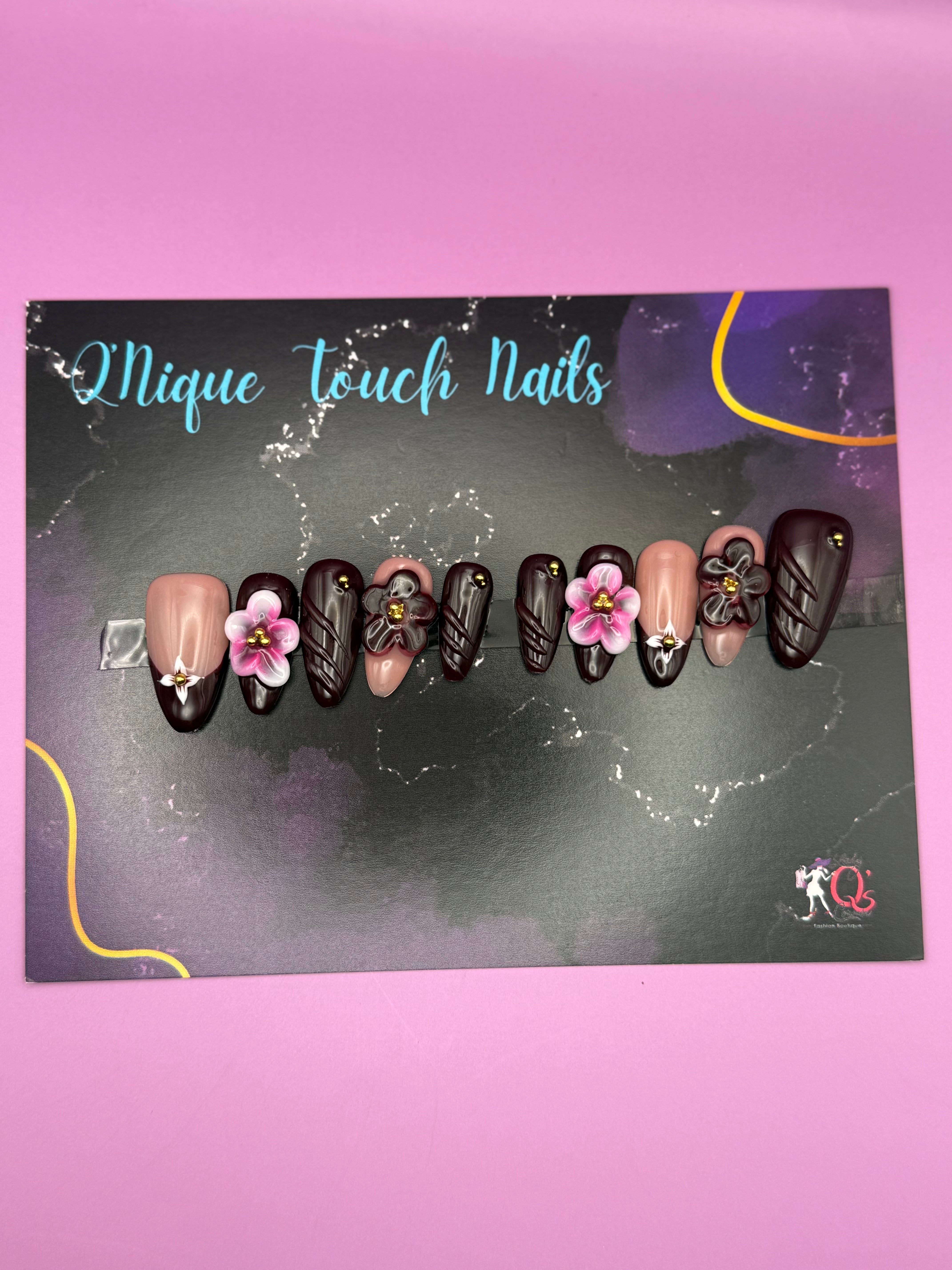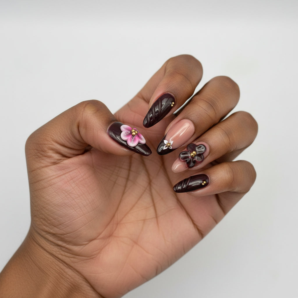 A rich cocoa-glam set kissed with 3D orchid florals, nude accents, and gold details. This luxe almond-length look blends deep chocolate shine with soft feminine bloom—perfect for elevating any outfit from brunch to date-night glam.
