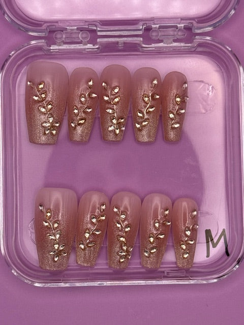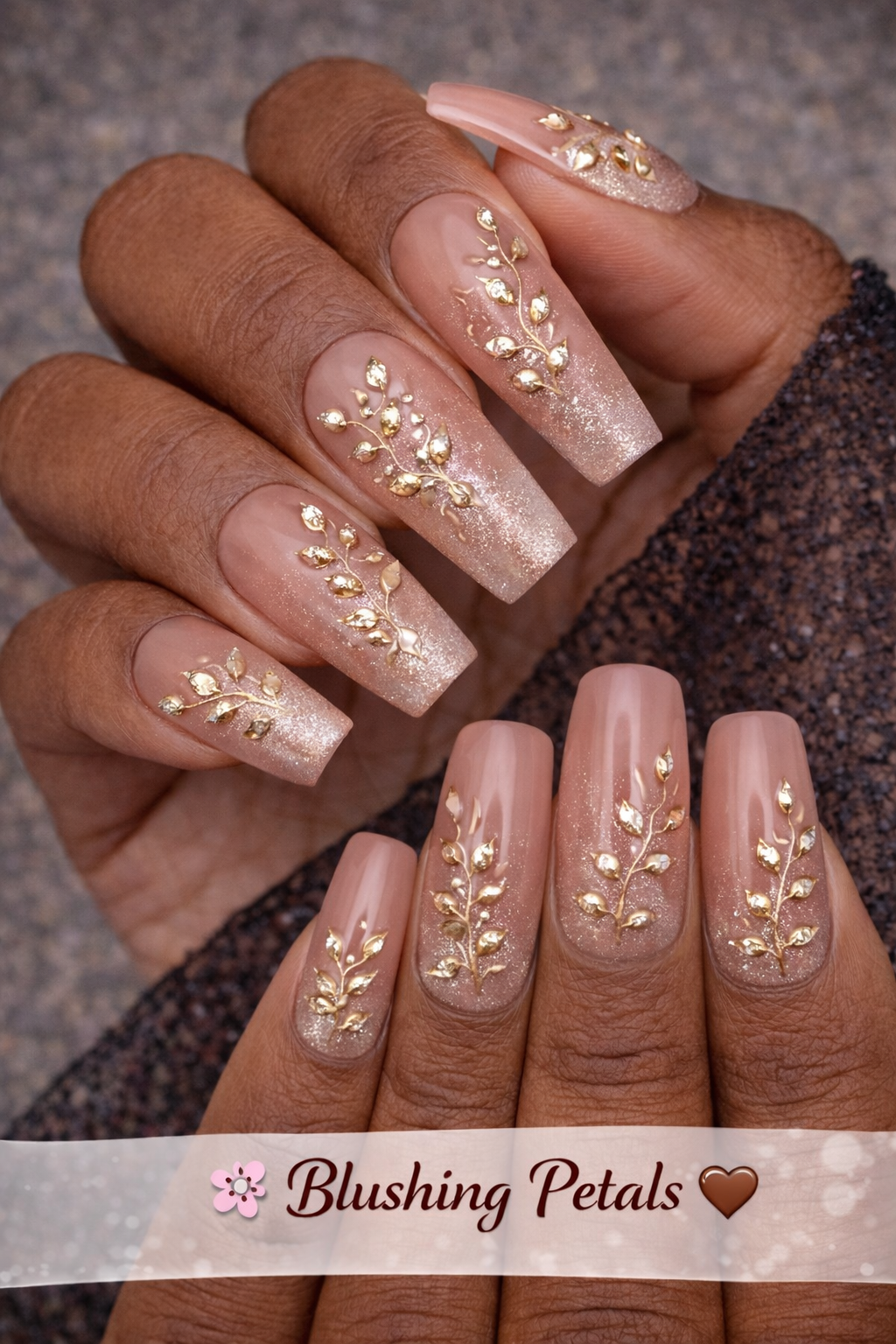 Soft nude-pink nails with shimmer and gold leaf accents—romantic, delicate, and timeless.