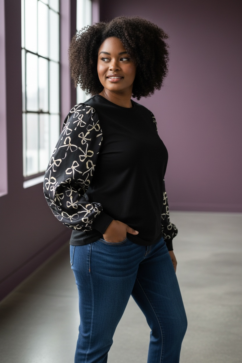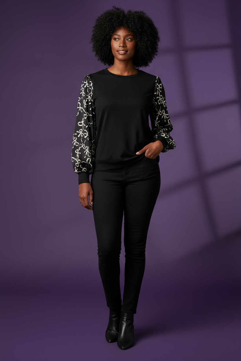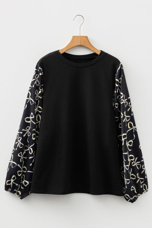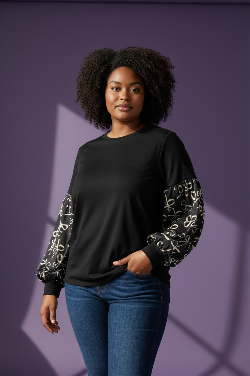 Elevate your wardrobe with this blouse. Featuring playful satin balloon sleeves decorated with a charming bow print, it perfectly blends cozy knit comfort with a touch of luxe satin shine. Whether you’re dressing up or keeping it casual, this chic plus top adds a fun and elegant twist to any outfit. Polyester/Cotton/SpandexPlus Size Info: See size chart for approximate measurements
