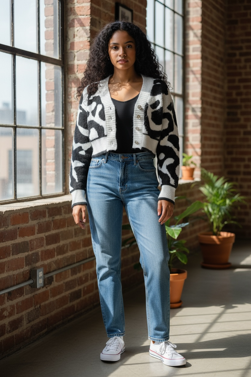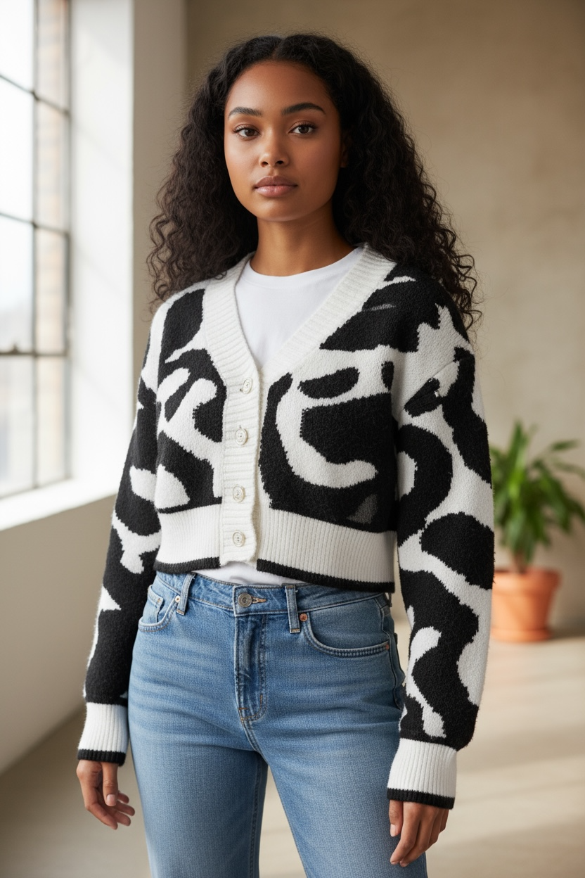 Elevate your wardrobe with our creative print cardigan! Featuring a unique and eye-catching design, this cardigan is perfect for making a statement. Made with high-quality materials, it offers both style and comfort. Upgrade your look and express your individuality with this must-have piece!