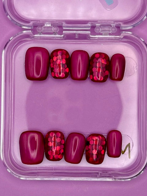 Turn heads with Berry Bombshell — a deep berry base paired with dazzling red confetti glitter accents for the perfect mix of sleek and sparkle. This set is bold, confident, and effortlessly glam, making it ideal for nights out, celebrations, or whenever you want your nails to steal the spotlight.