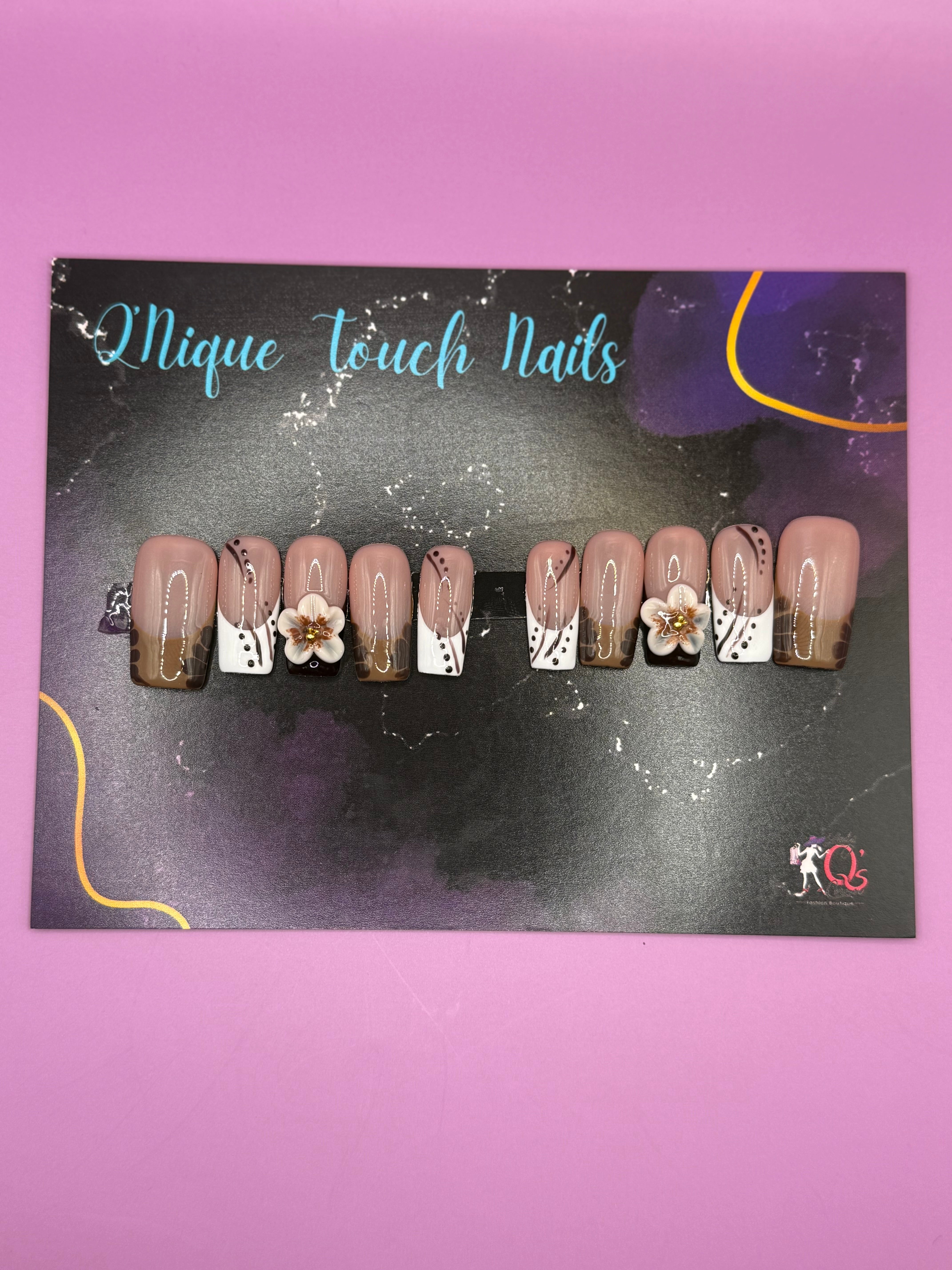 Brown Sugar Bloom blends warm, sweet mocha tones with crisp white accents and delicate floral charm. This set features artistic dotted detailing, soft abstract line work, and beautiful 3D flower embellishments that add the perfect touch of feminine elegance. The glossy nude-mocha base ties everything together for a look that’s both chic and irresistibly pretty.
