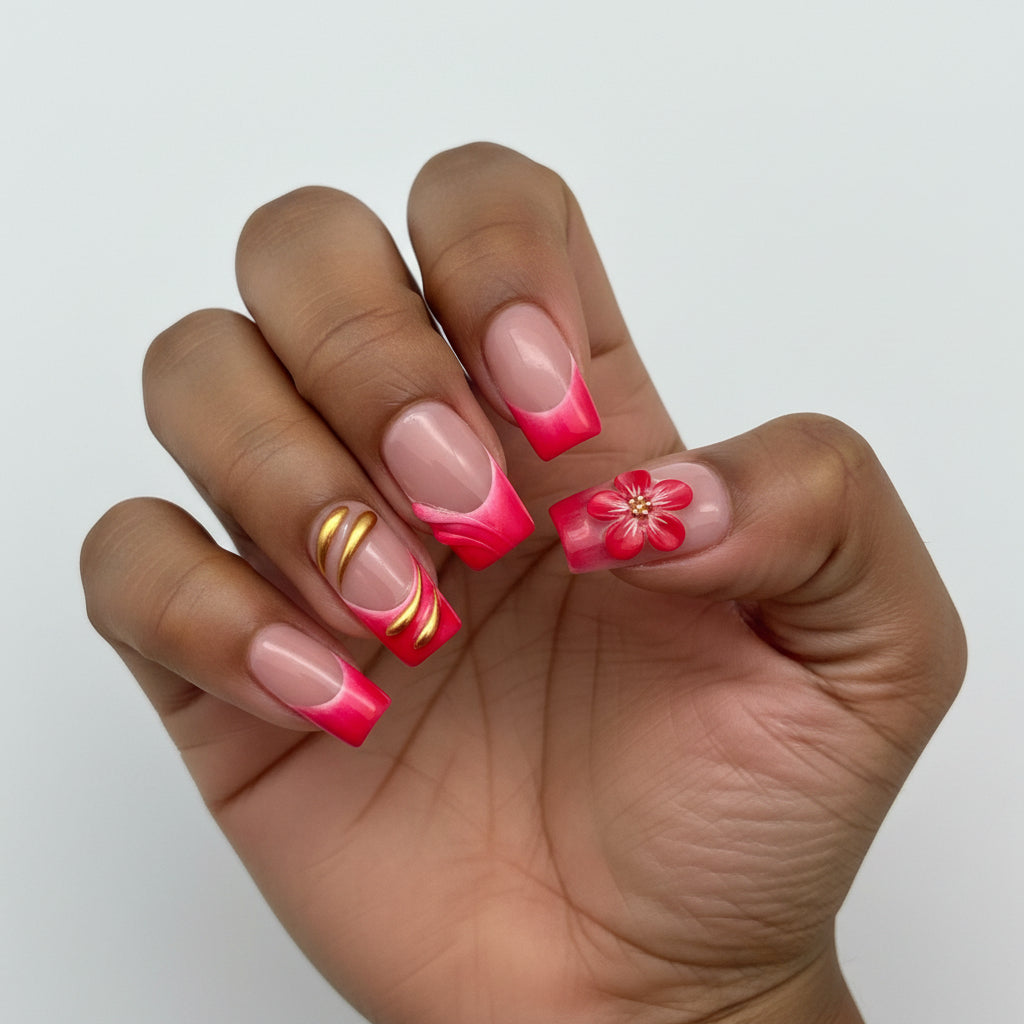 A rich fusion of pink passion, nude elegance, and sculpted gold for a powerful, couture-level finish.