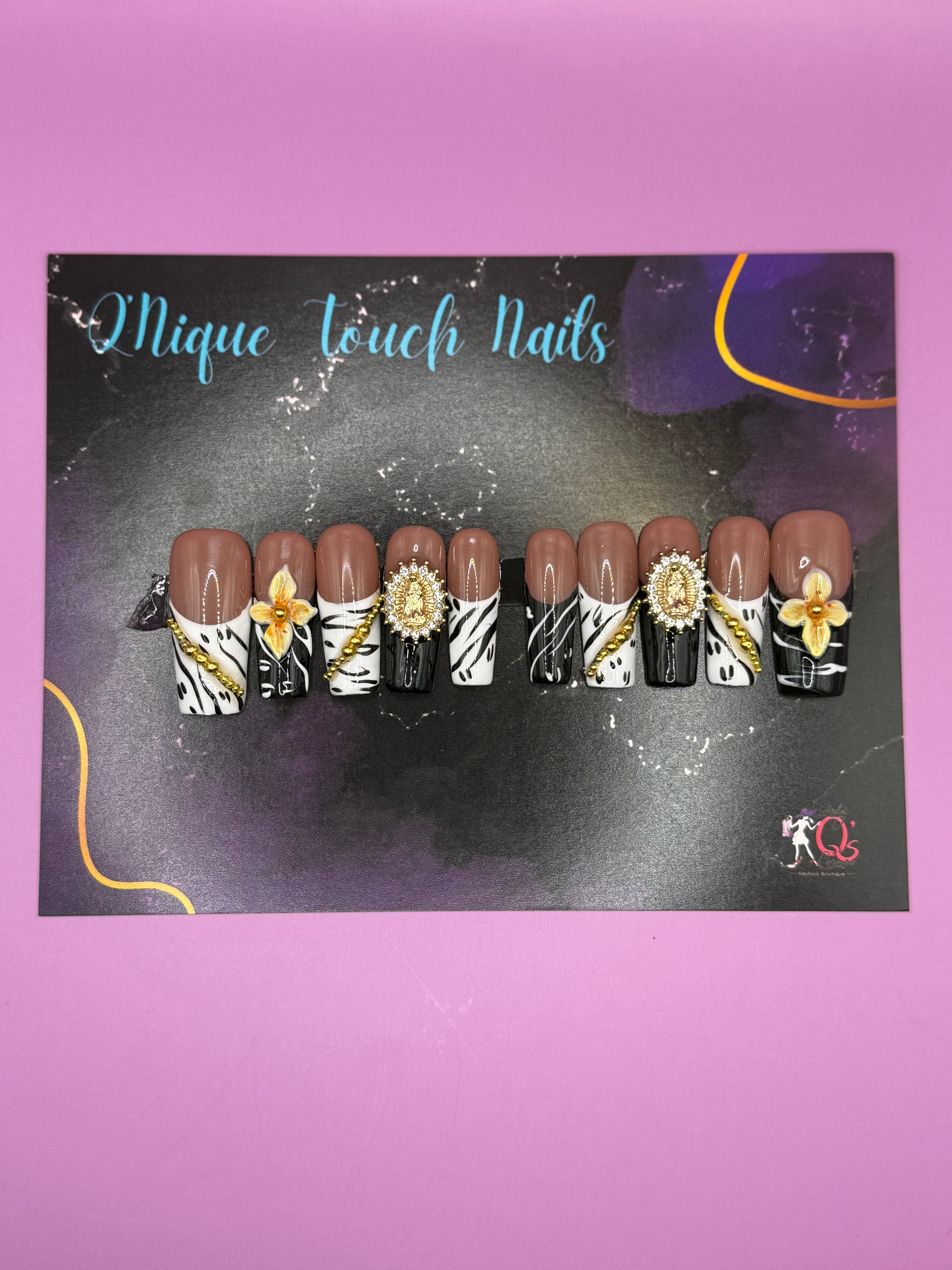 Safari Queen Couture brings together fierce pattern, rich tones, and luxe detailing for the ultimate bold-glam look. This stunning set features crisp black-and-white zebra-print tips paired with a warm mocha base, creating a striking high-fashion contrast. Gold chain accents, jeweled embellishments, and delicate 3D floral charms add a regal, couture-inspired finish worthy of any beauty queen.