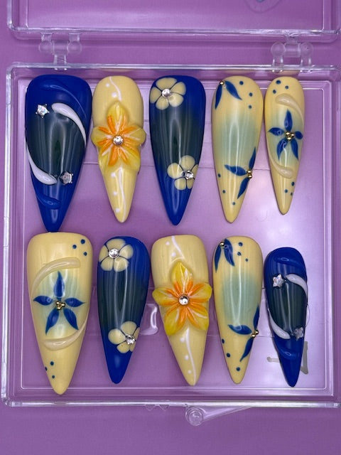 A dreamy stiletto set in buttery yellow and deep sapphire blue, finished with hand-painted florals, subtle shimmer, and crystal accents. Soft, feminine, and effortlessly elegant — perfect for spring, brunch dates, and sunshine moods.