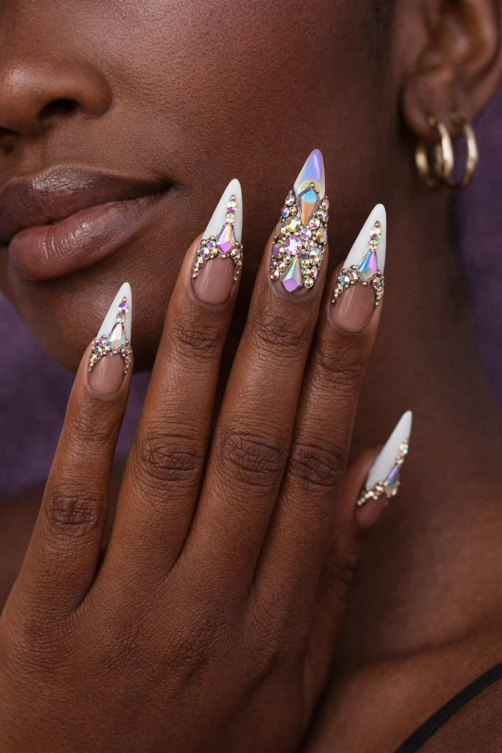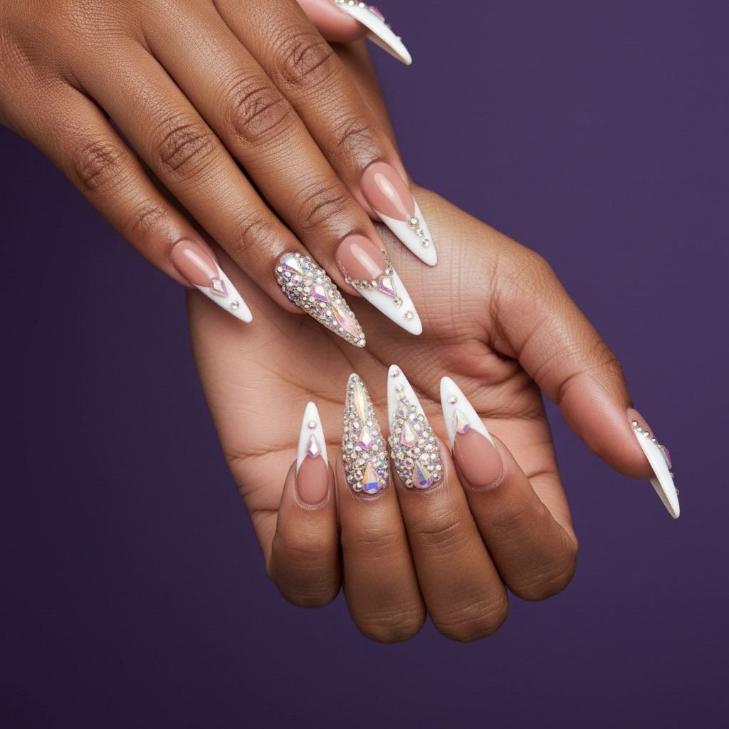 A white V-cut stiletto set drenched in iridescent crystals for a full iced-out glam look. Bold, shiny, and made to turn heads.