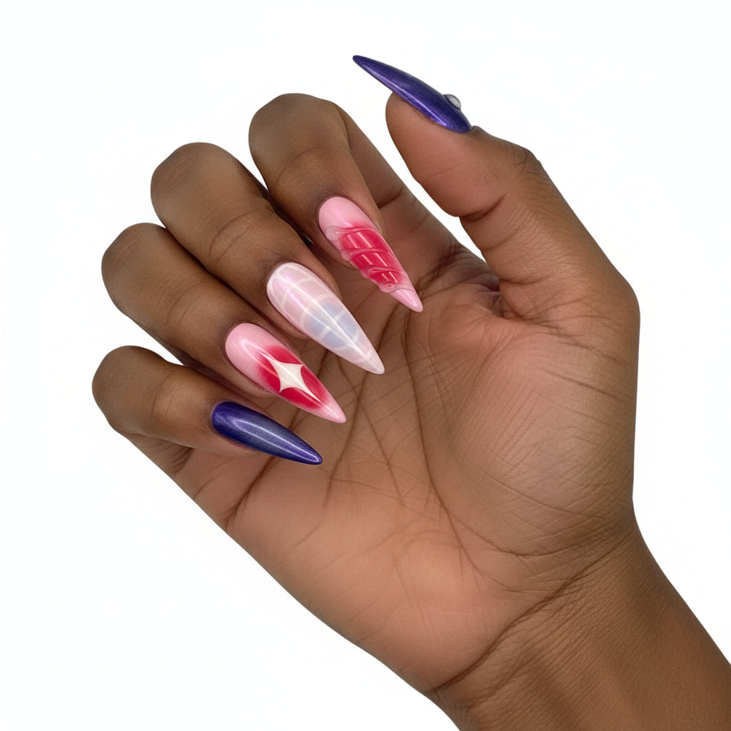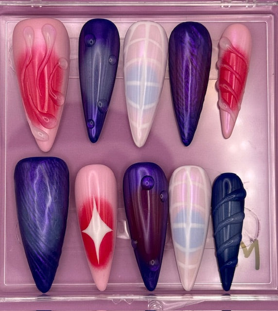 A bold stiletto set featuring electric purples, deep blues, soft blush, and holographic accents with sculpted 3D details and lightning-inspired art. Powerful, artistic, and unforgettable — this set is made for statement moments and star-level style.