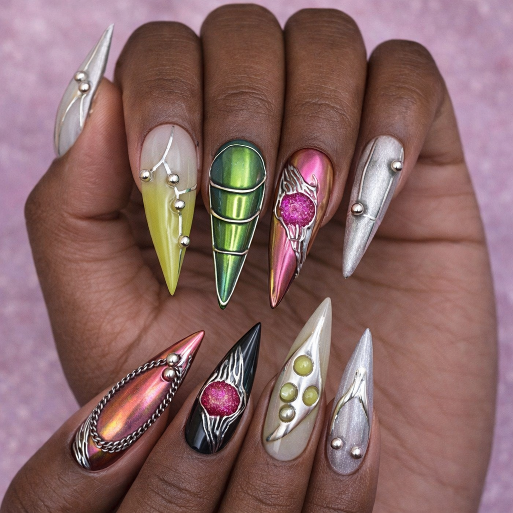 A bold stiletto set featuring electric green, molten pink, and chrome silver with sculpted metallic accents and luxe studs. Futuristic, fierce, and impossible to ignore.