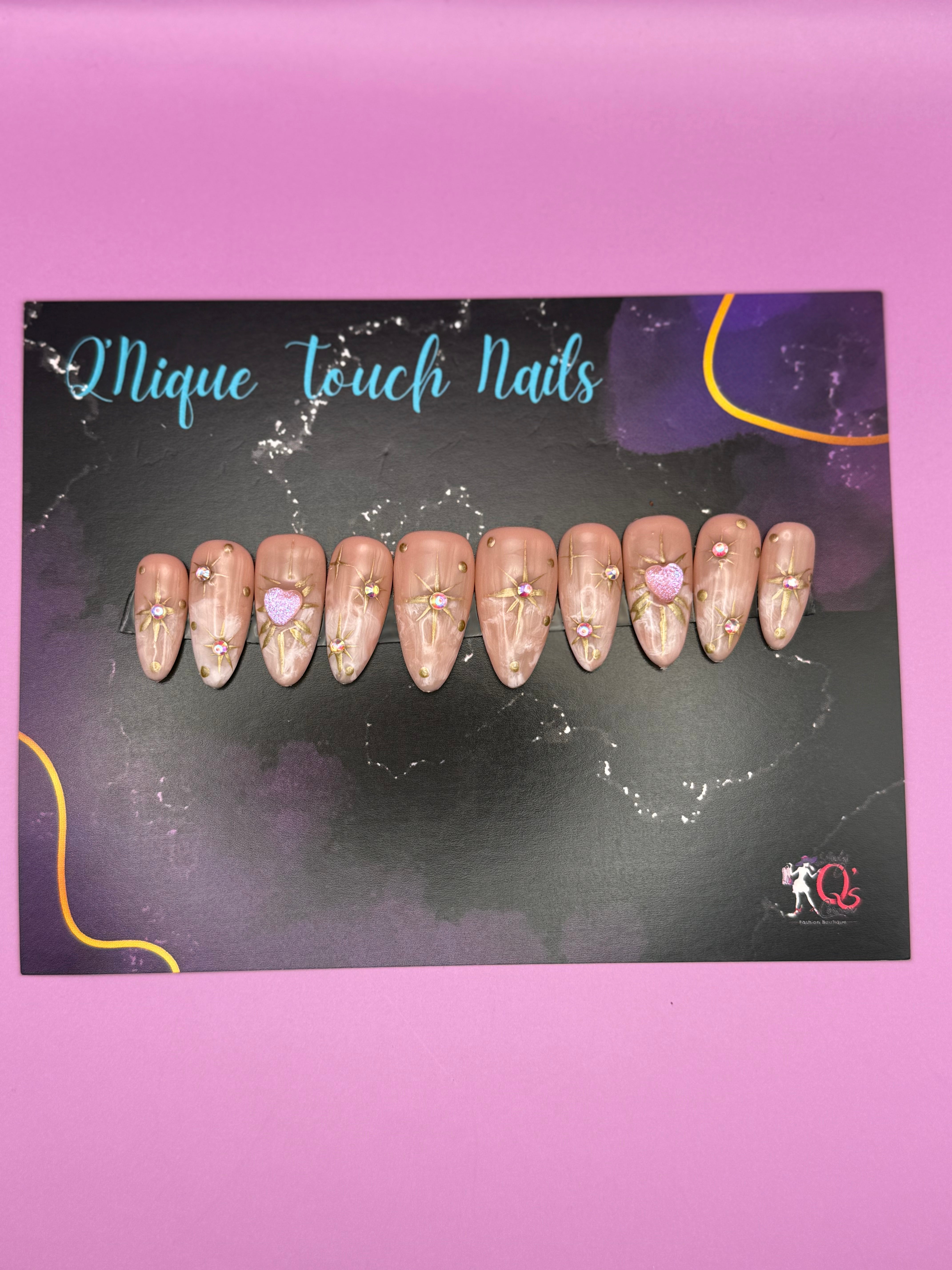 A flawless nude canvas topped with chic gold detailing and soft pink crystals. Effortless, elegant, and always in style.