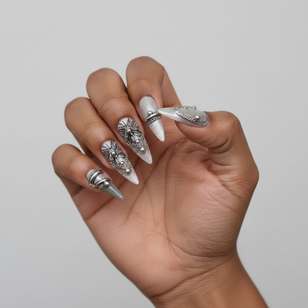 Titanium Goddess delivers a powerful blend of metallic elegance and bold, sculpted artistry. This stunning set features layered gray tones, shimmering silver highlights, and dramatic 3D embellishments that create a futuristic, goddess-like aesthetic. From chrome drip textures to glittered metallic accents and face-inspired sculptures, every nail is a statement piece crafted to command attention.