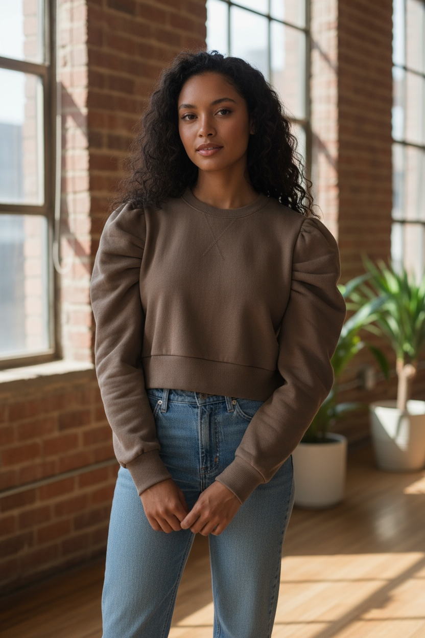 This mocha beauty brings a perfect mix of chill and chic. The puffed sleeves add just the right touch of drama, while the cropped fit gives it that modern edge. Soft, smooth, and easy to style, it’s the kind of top that looks just as good with jeans as it does with your favorite joggers.