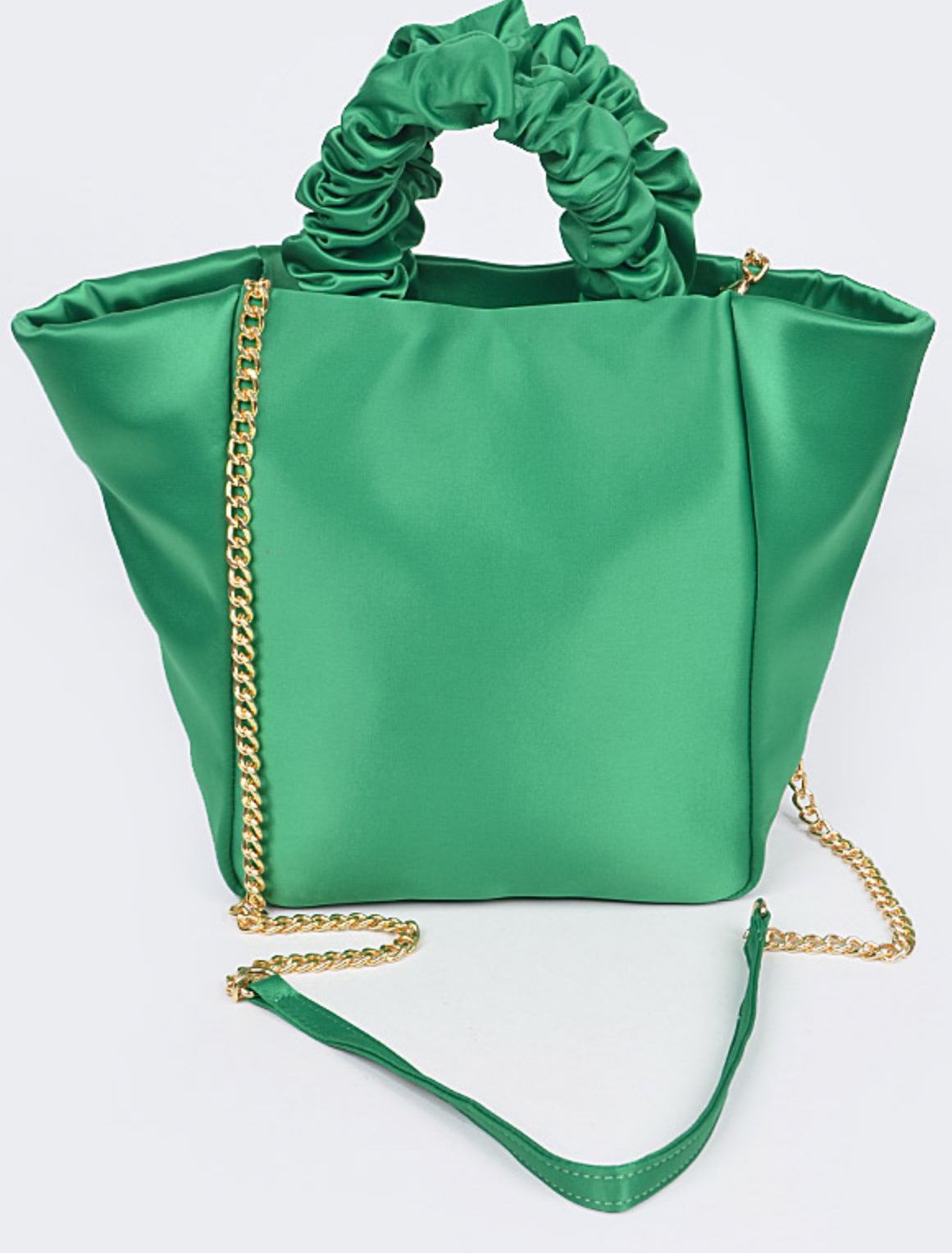 Refined yet bold, the Emerald Grace Tote brings sophistication to every look. Its scrunch handle and gold chain accents offer timeless charm, while the spacious interior keeps it practical for everyday wear.