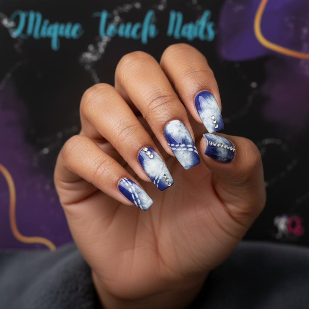 Add some sparkle to your wardrobe with Diamonds & Denim. These nails feature a unique blend of diamonds and denim, creating a stylish and eye-catching look. Show off your fashion sense with these trendy nails that are perfect for any occasion. Elevate your style game with Diamonds & Denim.