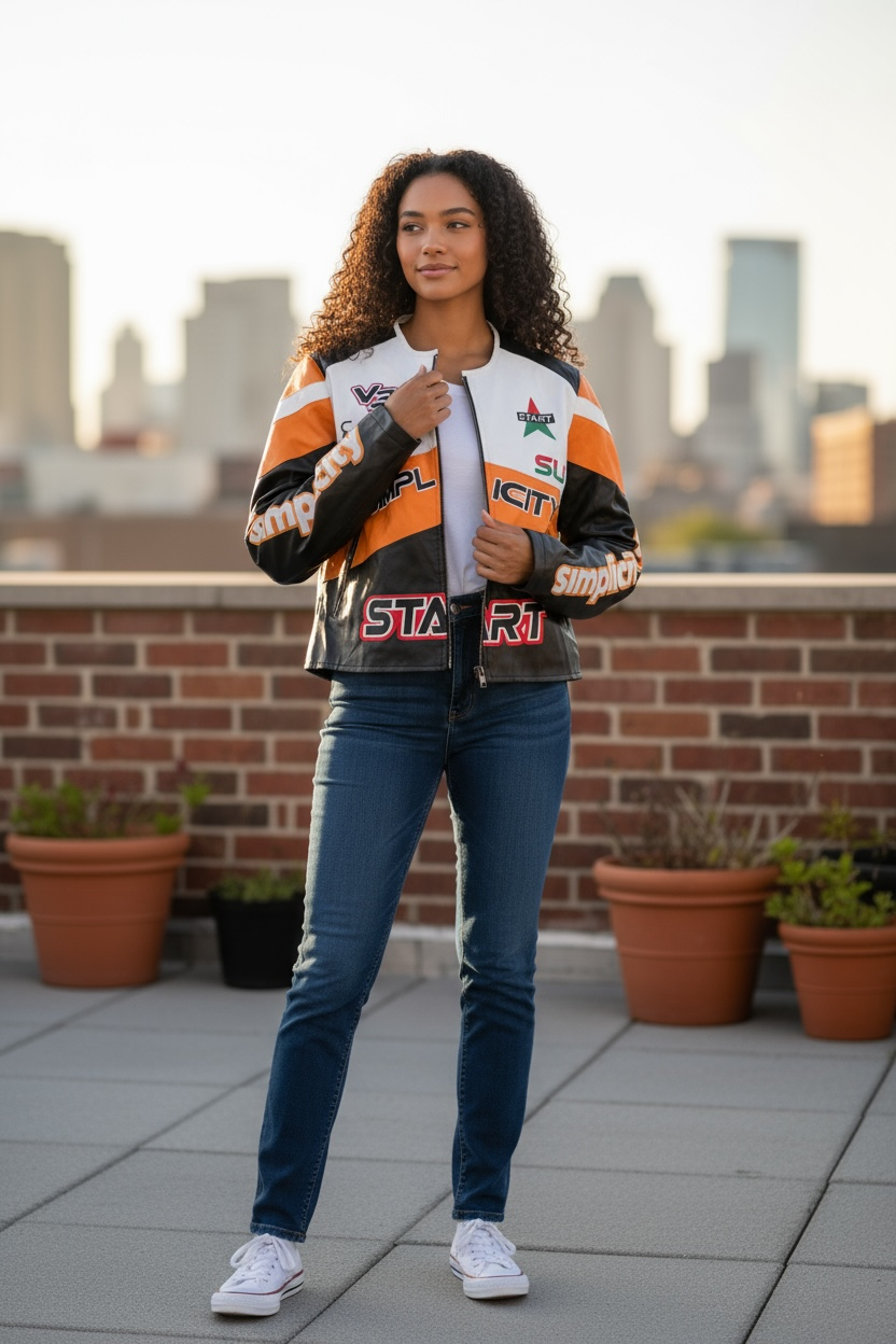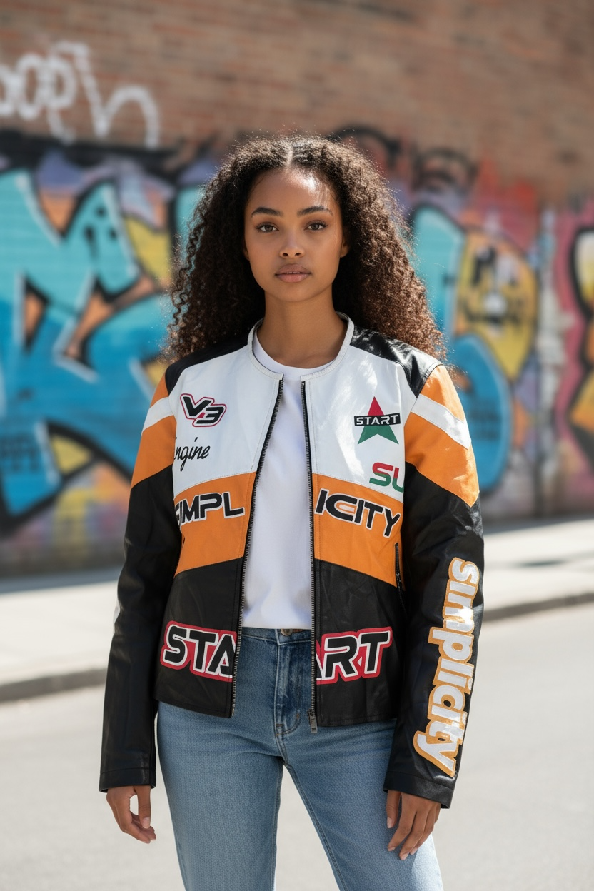 Bring the heat with our Street Racer Moto Jacket — a bold mix of orange, black, and white that commands attention. Featuring sleek faux leather, racing-style patches, and a zip-front fit, this jacket adds instant edge to any look.