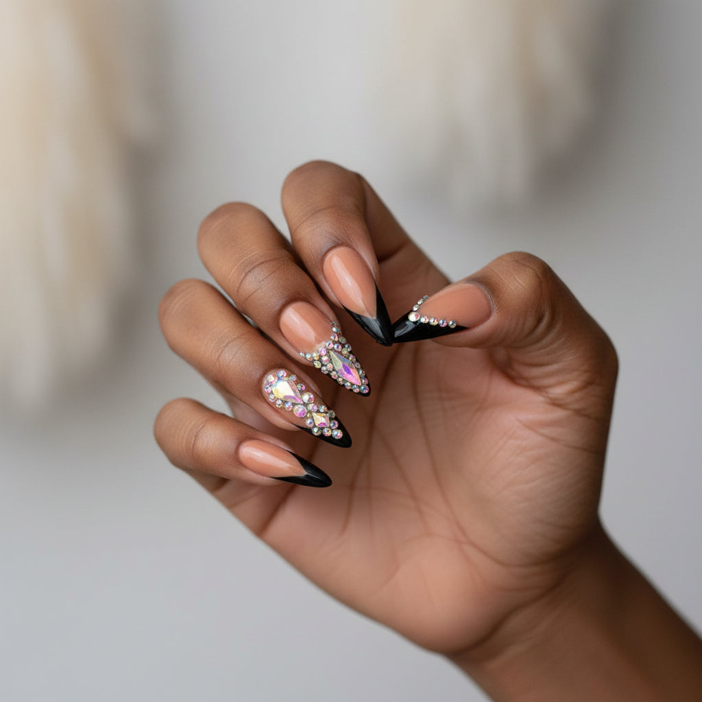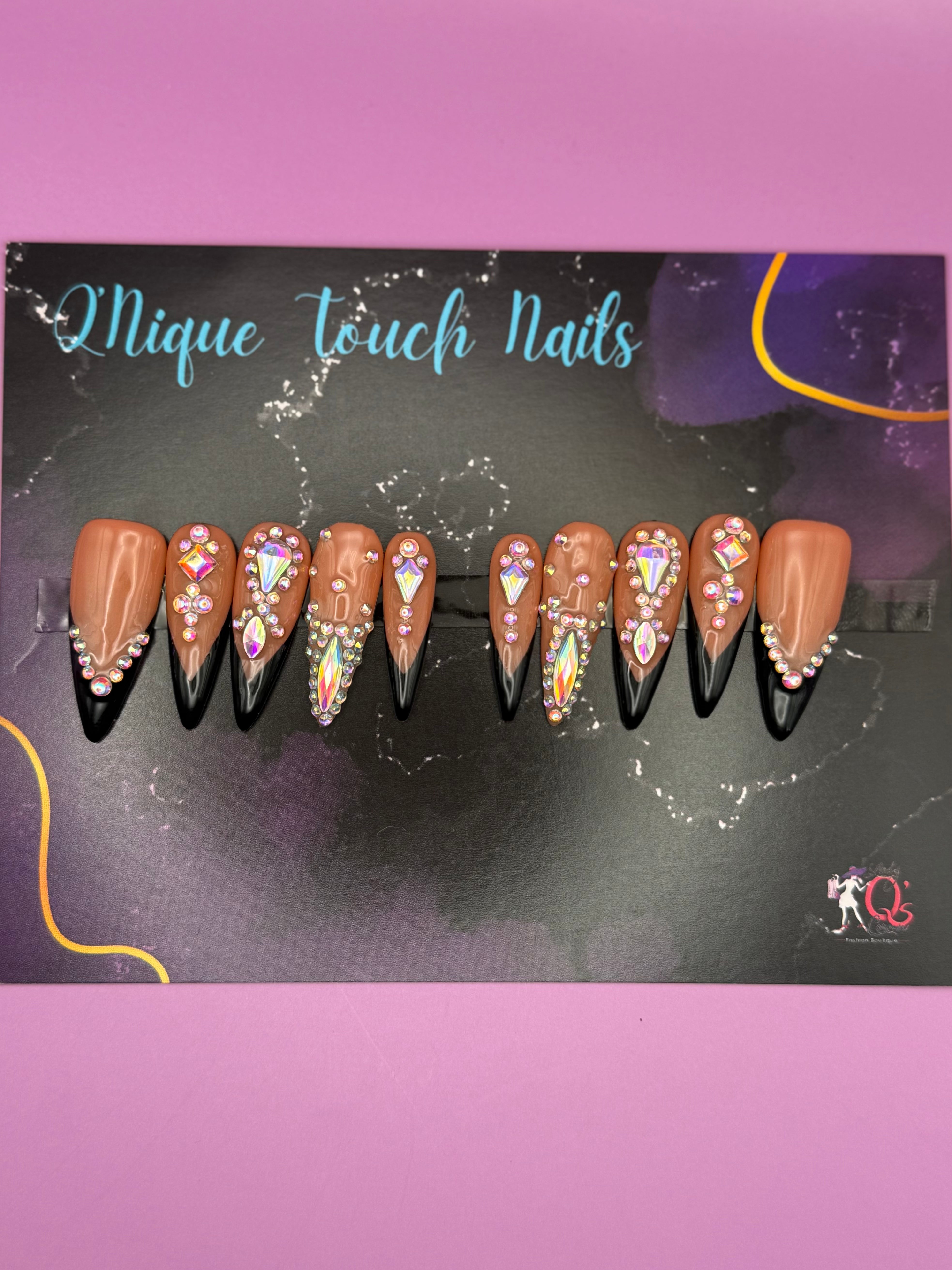 Long chocolate-to-black stiletto tips loaded with iridescent stones and crystal accents — bold, sexy, and built to shine on melanin.