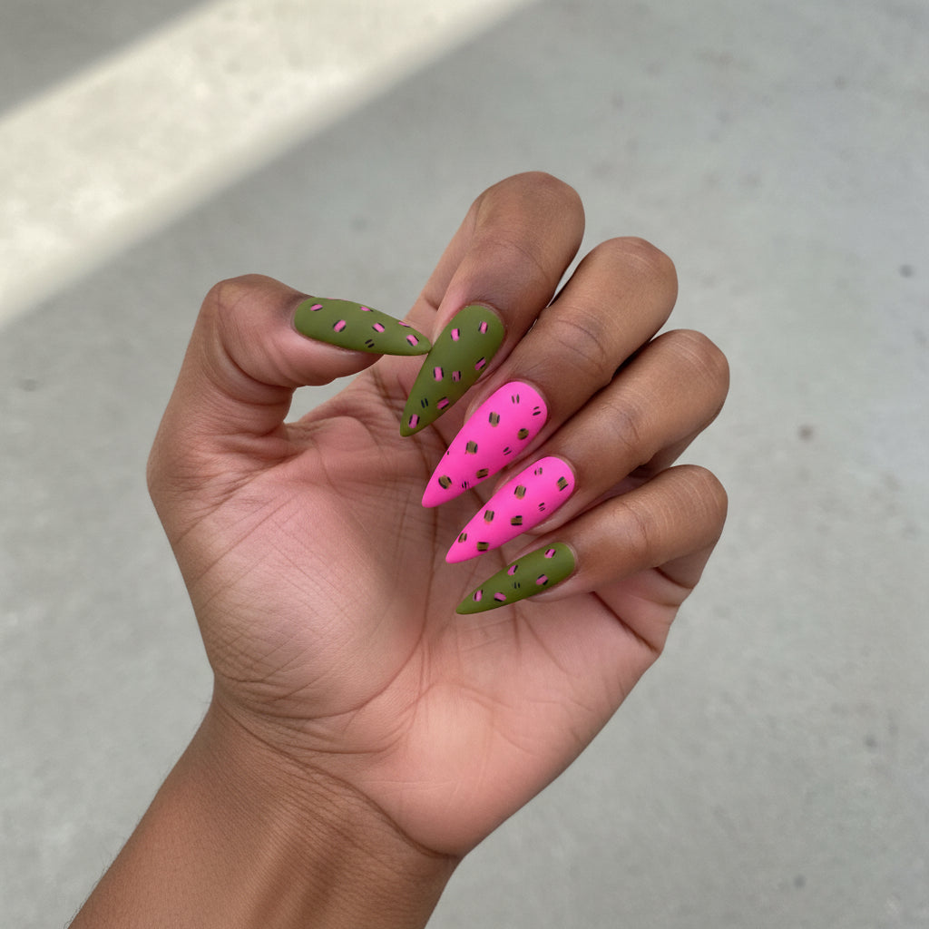 A vibrant stiletto set featuring juicy hot pink and fresh olive green with playful speckled detail for a bold, fruity statement. Bright, flirty, and made for summer days, vacations, and main-character moments.