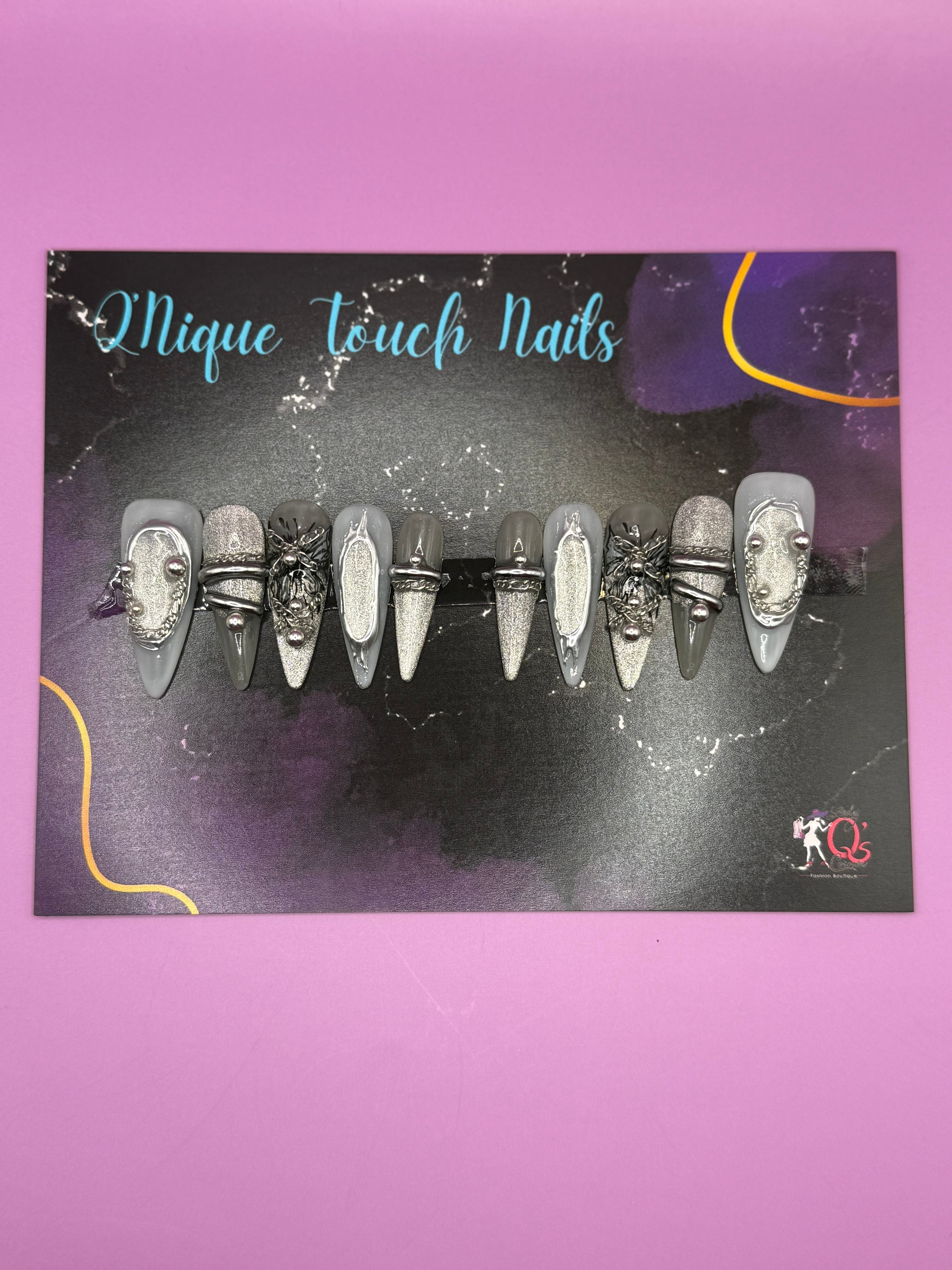 Titanium Goddess delivers a powerful blend of metallic elegance and bold, sculpted artistry. This stunning set features layered gray tones, shimmering silver highlights, and dramatic 3D embellishments that create a futuristic, goddess-like aesthetic. From chrome drip textures to glittered metallic accents and face-inspired sculptures, every nail is a statement piece crafted to command attention.